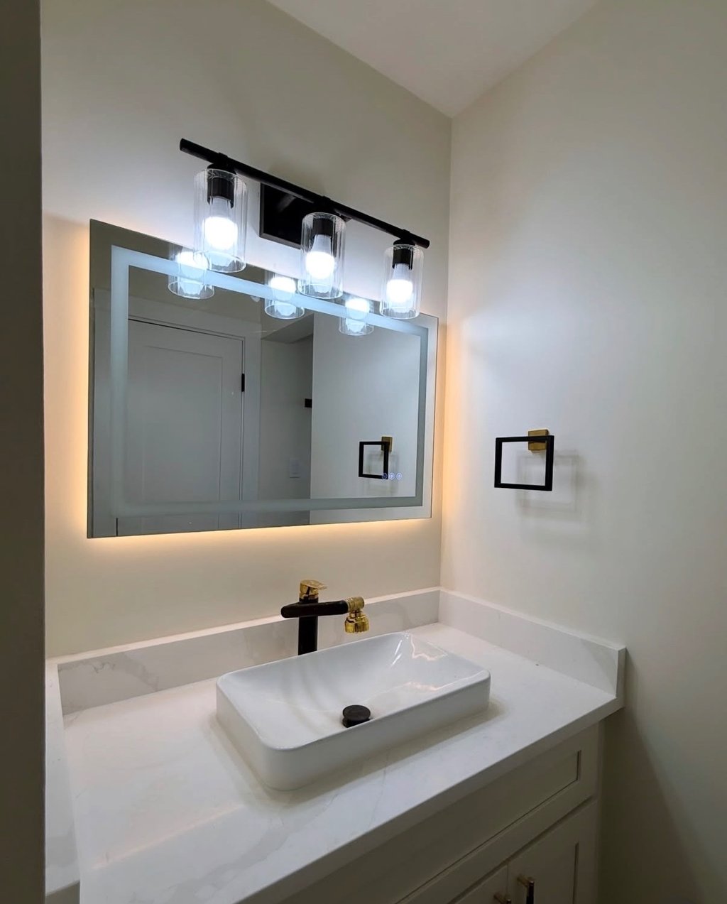 Modern bathroom remodeling featuring a vessel sink, wall-mounted faucet, quartz countertop, and LED mirror lighting for a clean, contemporary finish.