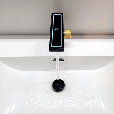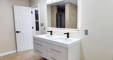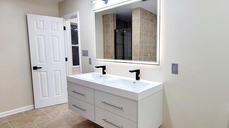 Bathroom remodeling featuring a custom floating double vanity with integrated LED lighting and a modern LED temperature display faucet. The space includes a frameless glass shower, upgraded fixtures, and large-format tile finishes, creating a sleek, contemporary bathroom designed for both style and functionality.