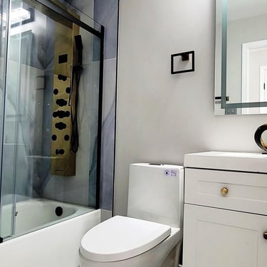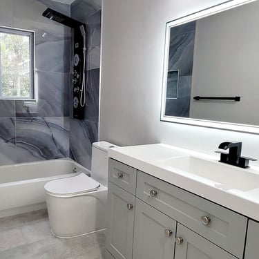 Bathroom remodeling in Manassas, VA featuring a frameless glass shower, custom floating vanity, and upgraded lighting for a clean, contemporary design. Completed with large-format 24x48 porcelain wall tiles and a luxury multi-function shower system, combining modern style with everyday functionality.